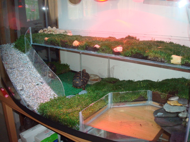 #2: Si tienes un jardín o un sitio donde ella puede vivir suelta sin escaparse, la puedes tener allí tranquilamente CON AL MENOS un espacio para ella donde pueda meterse para nadar o beber agua. Si la tienes en casa, en el porche o en algún sitio cerrado, es recomendable que: 1. El terrario sea 4 veces el tamaño de tu tortuga para que tenga espacio suficiente para andar. 2. Que tenga dos zonas: una acuática (donde pueda nadar, comer y beber) y otra zona seca (donde pueda tomar el sol, descansar, poner huevos si es una hembra, o andar). 3. Que tenga algo de decoración (NADA que la tortuga se pueda comer o sea tóxico para ella) por ejemplo: plantas acuáticas, piedras (no muy pequeñas, ya que se las puede comer) o algún papel puesto alrededor del terrario (simulando un espacio natural para ella). Por ejemplo, este está bastante bien (demasiado grande, pero mejor).
